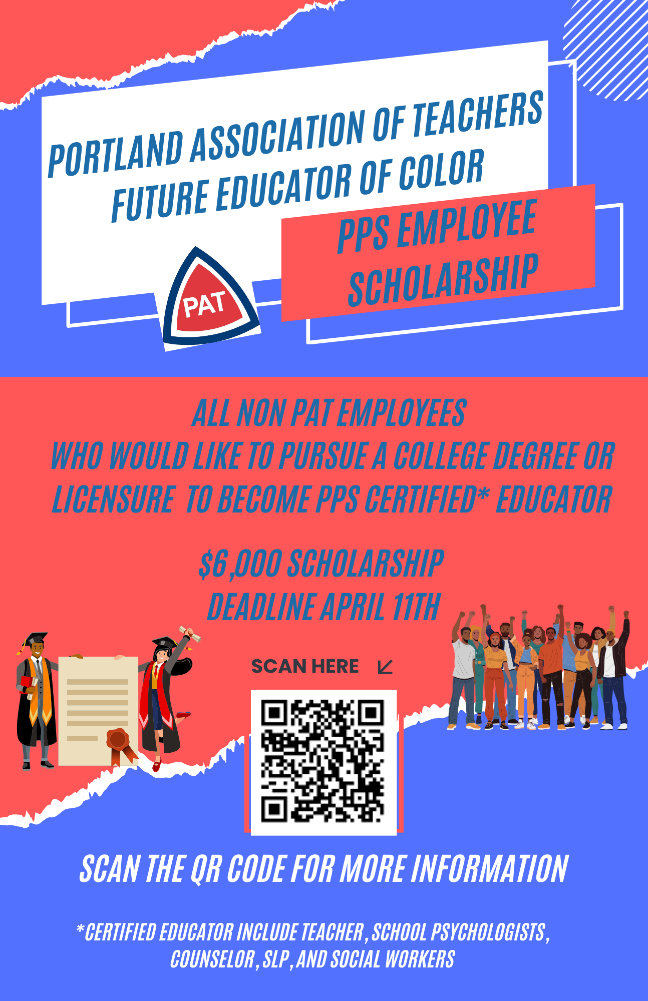 - One $6,000 scholarship will be awarded to a Portland Public Schools employee (PAT bargaining unit positions are not eligible) currently enrolled in a university program to become a certified educator. Any classified or non-represented employees, such as bus drivers, para-educators, community agents, custodians and nutrition services workers are eligible to apply.