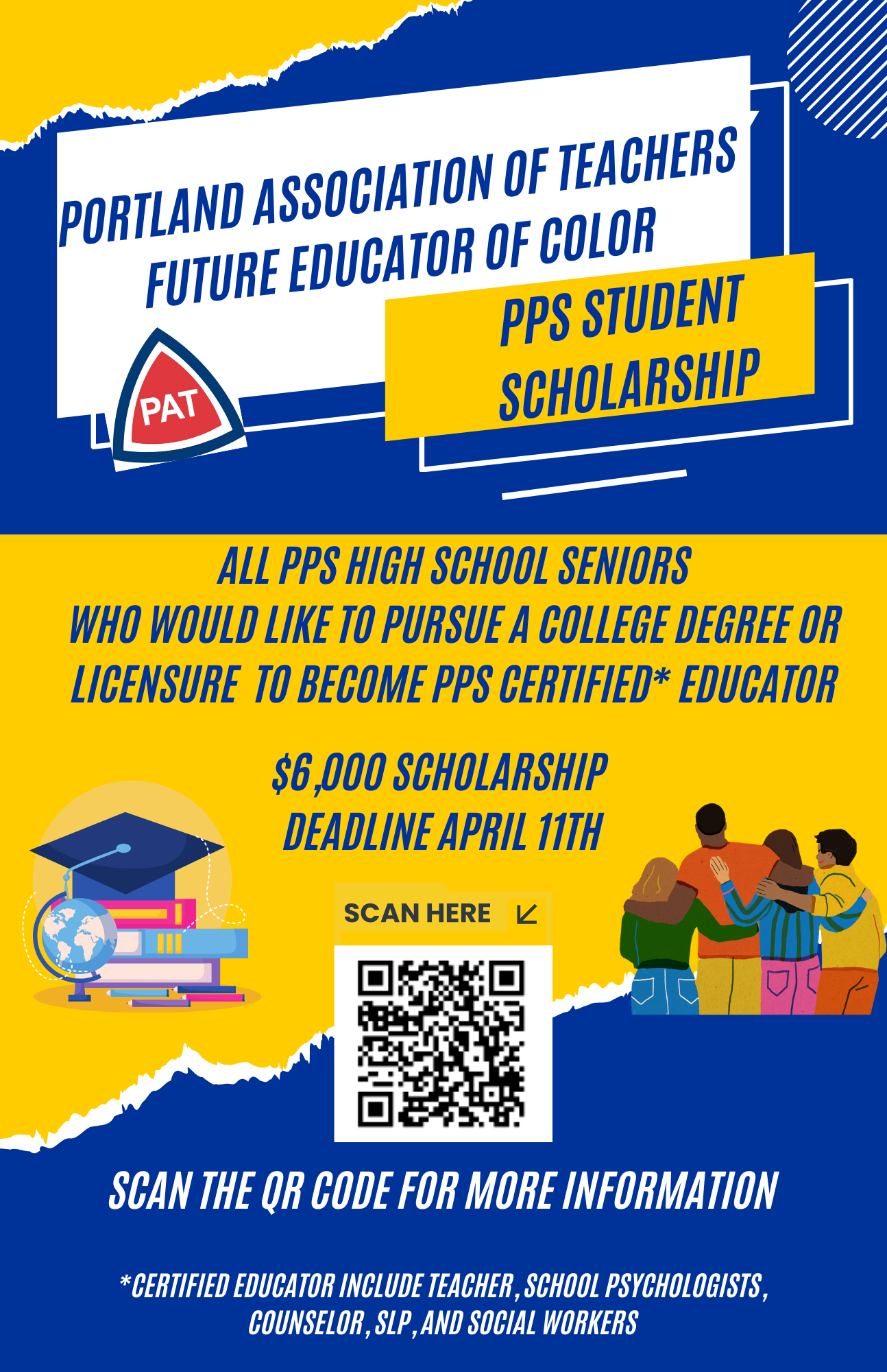 One $6,000 scholarship will be awarded to a Portland Public Schools graduating senior who plans on enrolling in a college or university program to begin their journey towards becoming an educator.